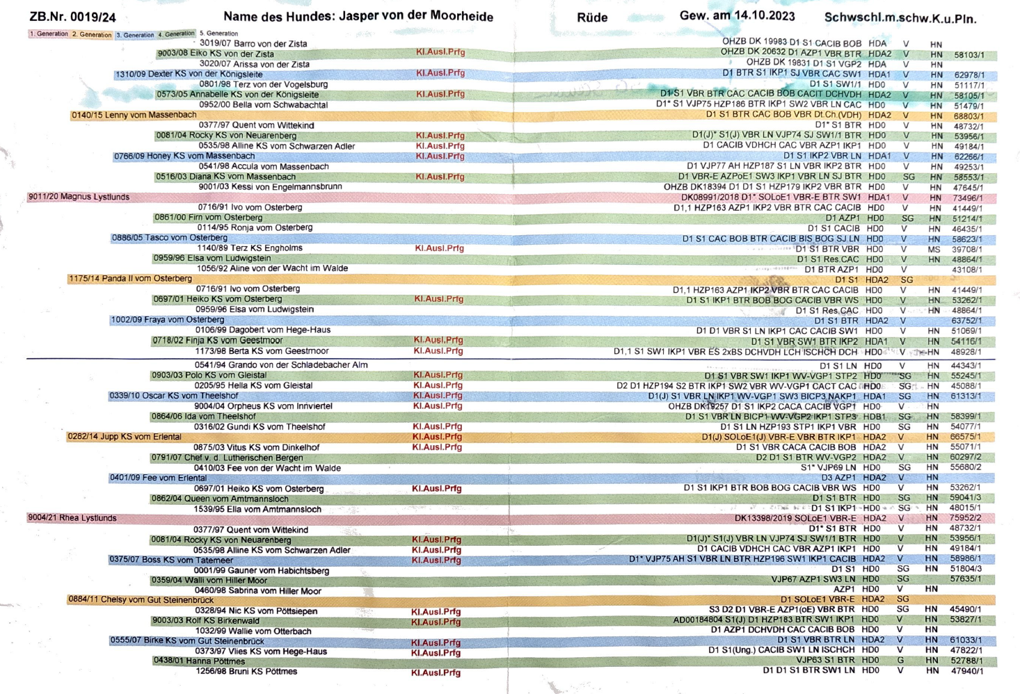 D1, S1, VGP 1 (334 Pkt.), BTR, HN, Fw sg, Stockmaß 66 cm, HD A2/frei, OCD beidseits frei, Übergangswirbel frei