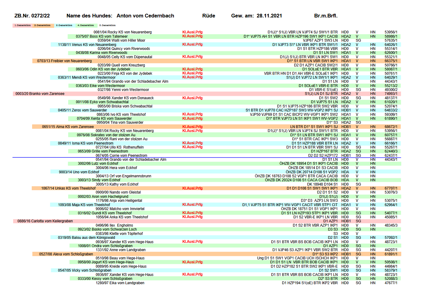 Kleemann (alles 4), HN, LN, BTR, D1 (4h Vorstehen), S1 (4h Vorstehen) Suchensieger, HZP 220 Pkt., VGP1 (349 Pkt. Totverbeller, 4h Wasser), Armbruster Haltabzeichen (AH, spurlaut) Suchensieger, SJ, HDA2, ED+OCD sowie Übergangswirbel fehlerfrei, Formwert: V2, Größe 67cm