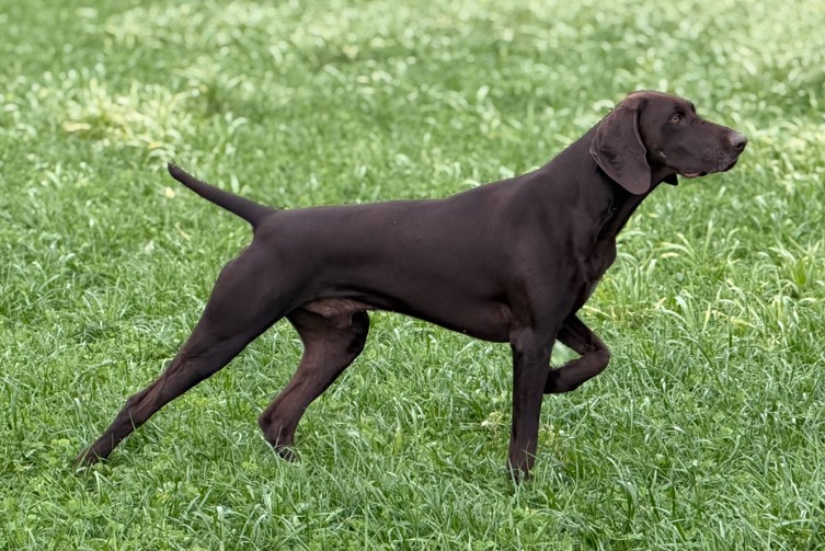 Ein ansprechender Typvoller Nachwuchsrüde mit maskulinem Kopf und bestehendem tiefdunklen Braun, Er stammt aus einem Leistungsstarken frühreifen Wurf mit hohen Formwerten. Seine Stärke zeigt er im Wasser mit ausgeprägtem Durchhaltewillen, sowie im Feld mit einer brillanten Nasenführung und Kopfhaltung und bei der Nachsuche im Wald. Er ist ein ruhiger verträglicher Jagdgefährte der im Jagdbetrieb viel Freude beschert.