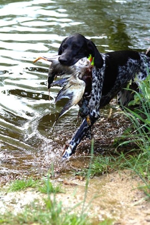 Beschreibung: Leistungsstarker Rüde (68 cm) im ständigen Jagdeinsatz. Alex überzeugt durch festes Vorstehen, passioniertes Stöbern, Wasserfreudigkeit und sehr starken Apportierwillen (aktuell Jagdkönig bei der letzten Jagd). Wesen: Absolut führerbezogen und treu, offen gegenüber anderen Hunden und sehr familienfreundlich. Abgabe an Jäger, da der Hund jagdlich geführt werden will.