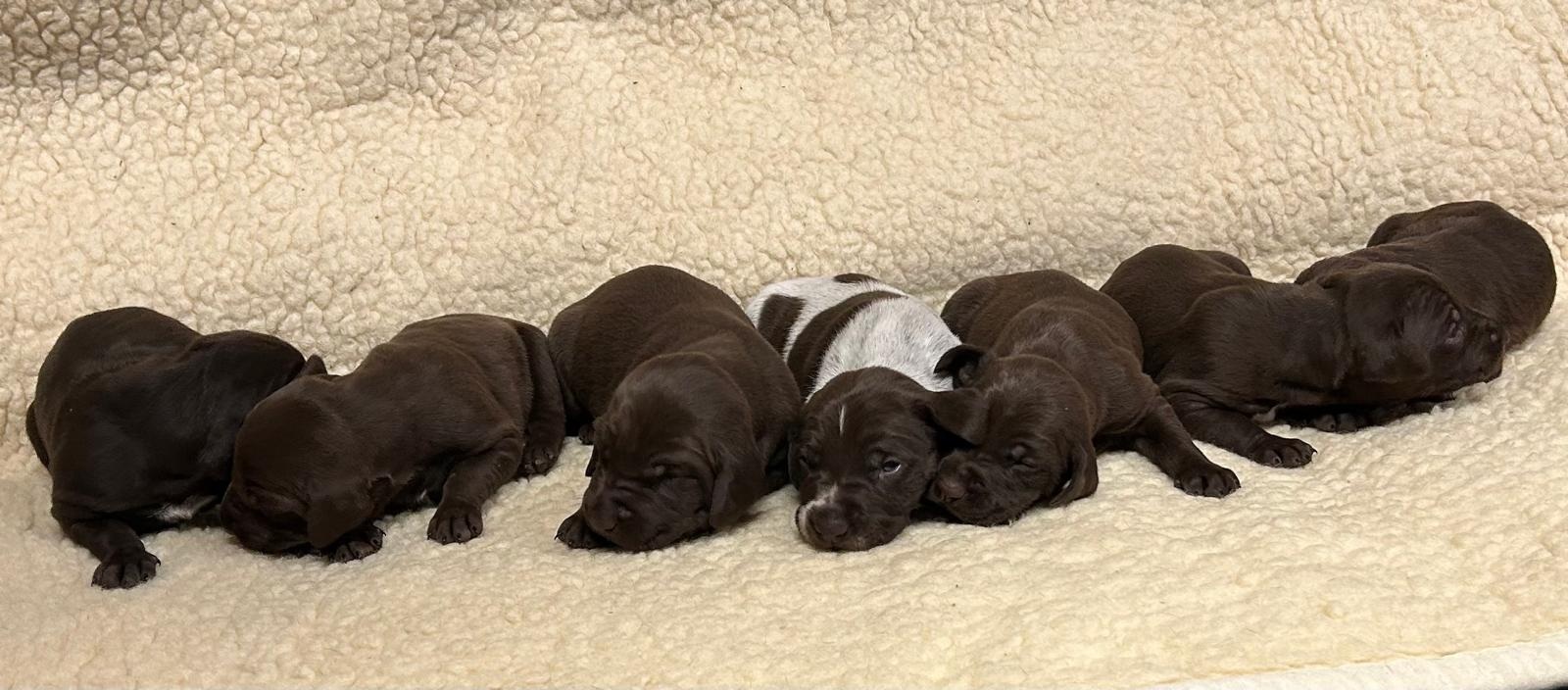 Leistungsstarker A-Wurf vom 21.10.2025 aus passionierter Verpaarung. Wir freuen uns über 7/3 gesunde, muntere und starke Welpen in Braun, Braunschimmel und Schwarz.