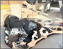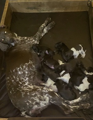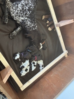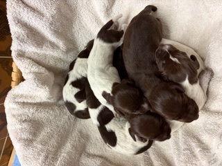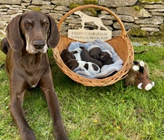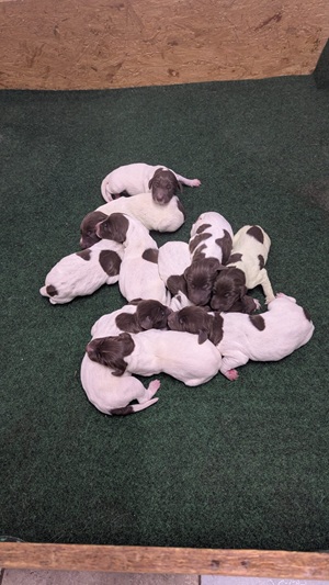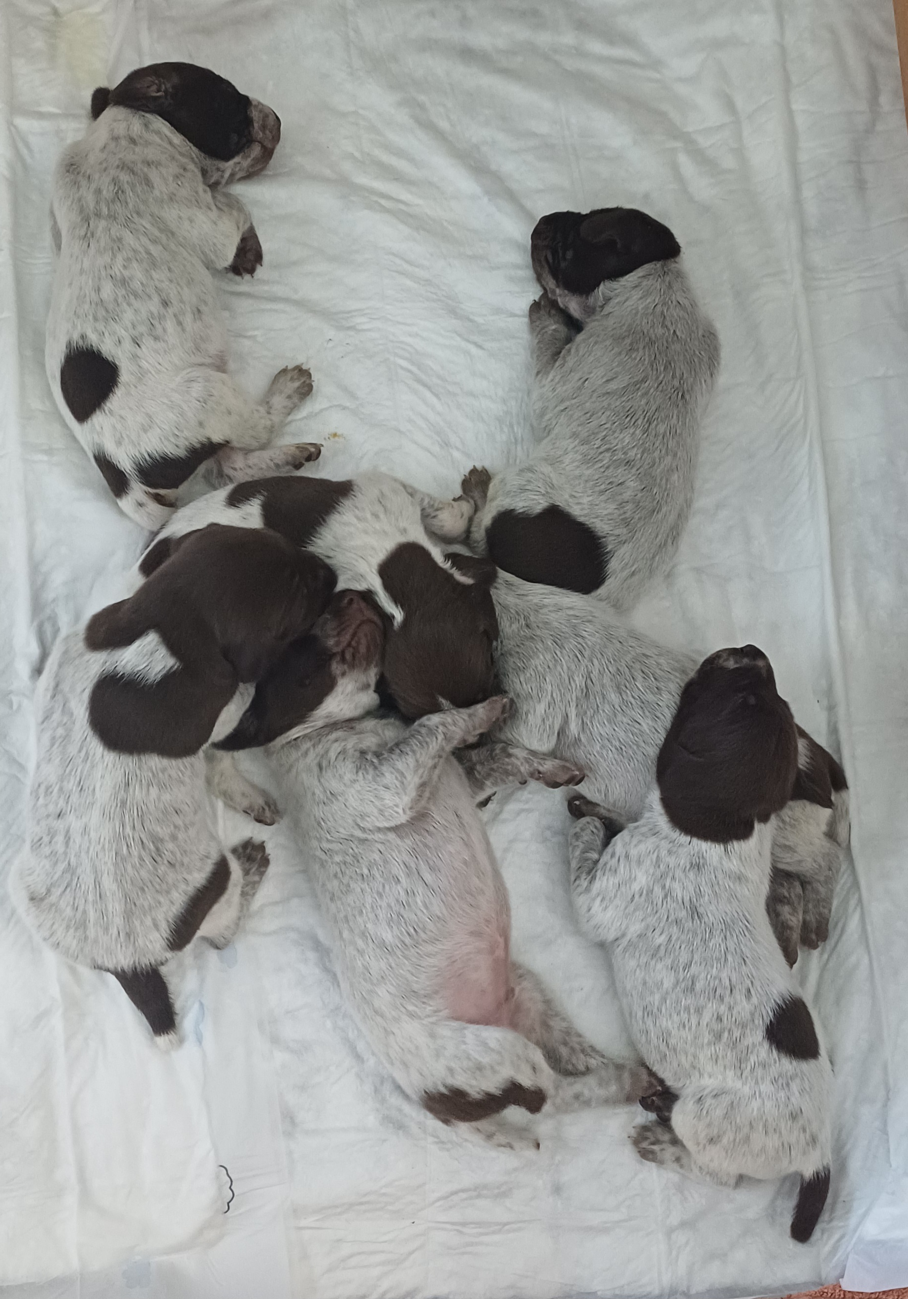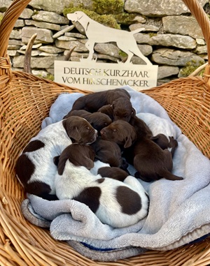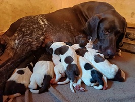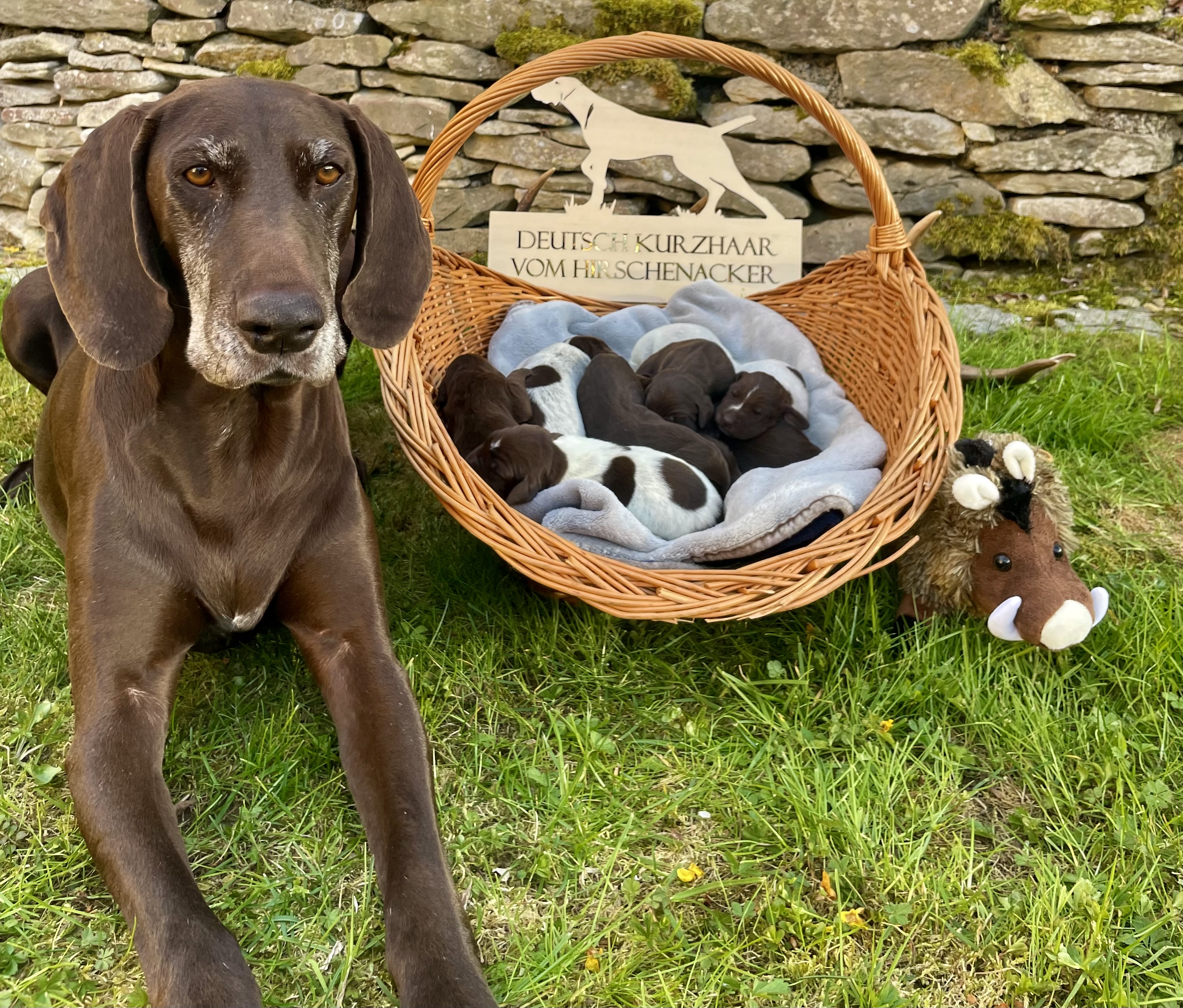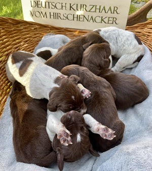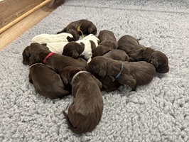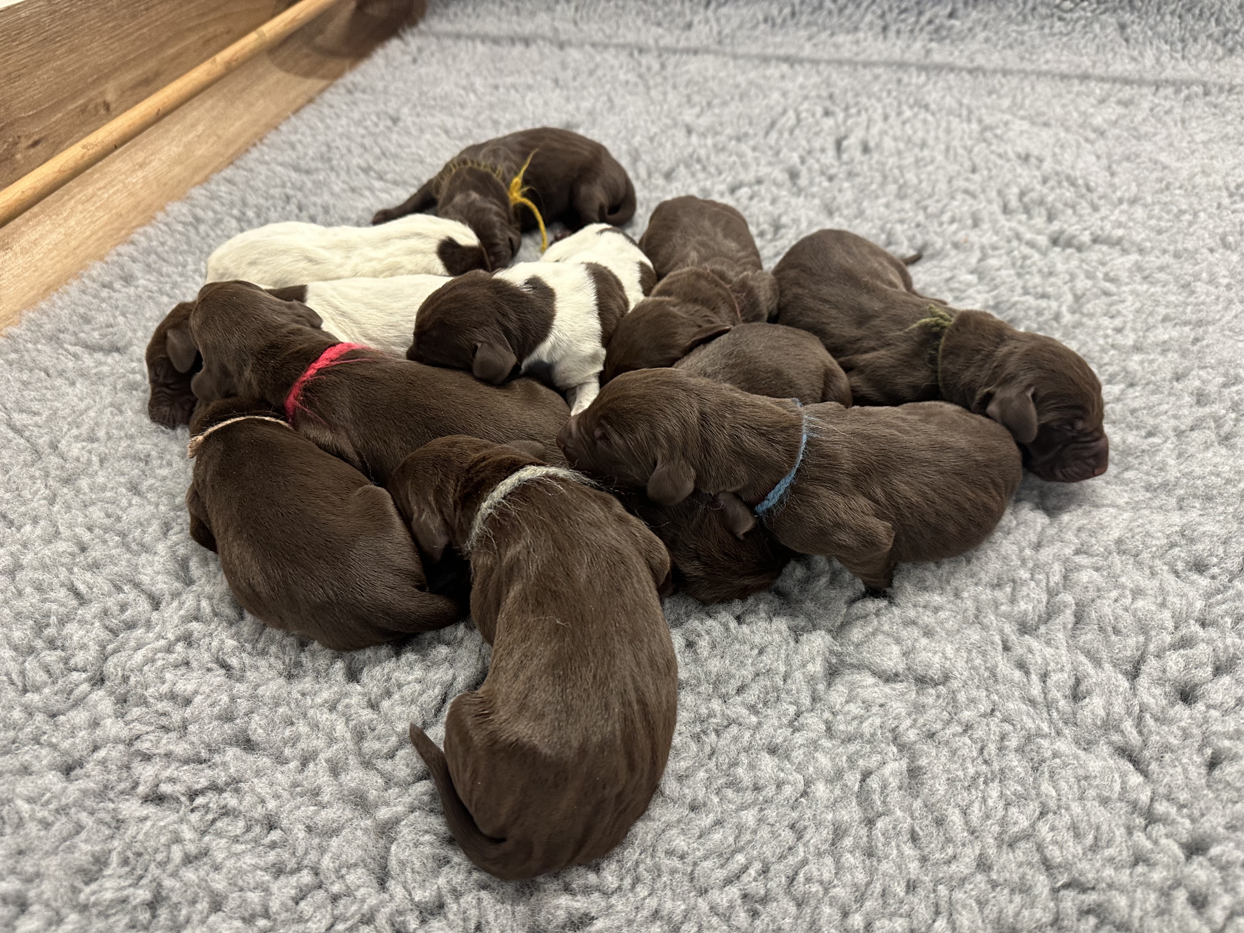 Der M- Wurf ist gefallen. 5,5 Welpen brschl. mit br. Kopf sind am 9.4.2026 zur Welt gekommen.
