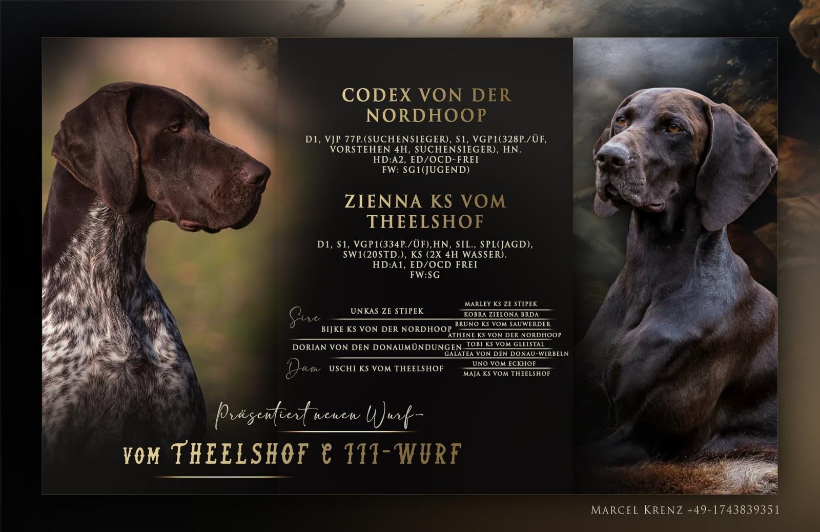Codex ist ein substanzvoller Braunschimmelrüde mit kräftigem Rüdenschädel und stabilem Knochenbau. Bereits im ersten Feld hat er eine makellose Prüfungslaufbahn absolviert. Er überzeugt durch große Wesensfestigkeit, ausgeprägte Wasserfreude und Härte. In einem sehr guten Niederwildrevier stehend zeigt er einen hervorragenden Suchenstil sowie eine sehr feine Nase. Auf der Mutterseite führt Codex klangvolle Namen wie KS Bijke und KS Athene von der Nordhoop sowie KS Bruno und KS Xenta vom Sauwerder. Väterlicherseits geht er über die bekannte und erfolgreiche tschechische Linie ze Stipek (Ludek Müller).