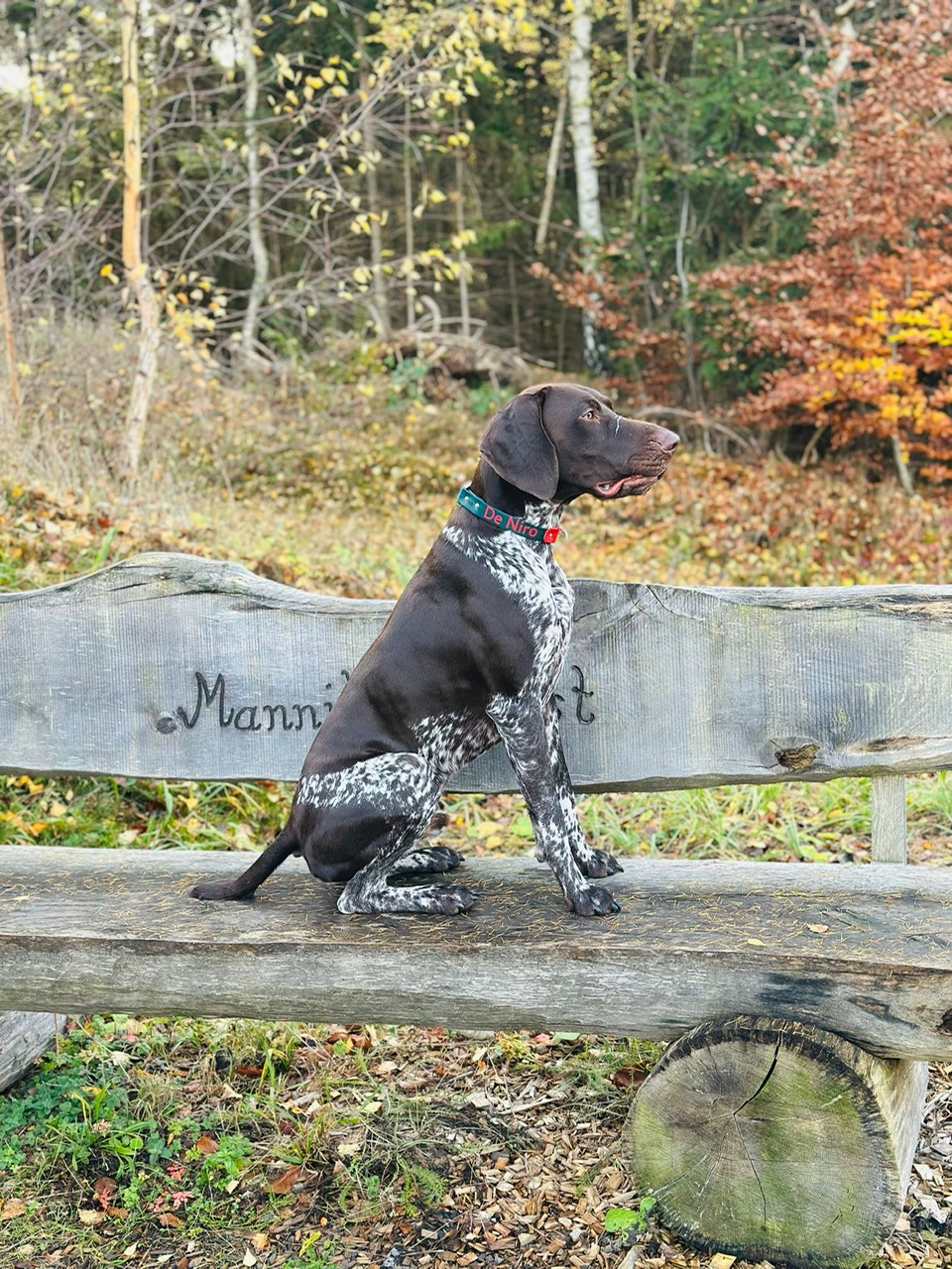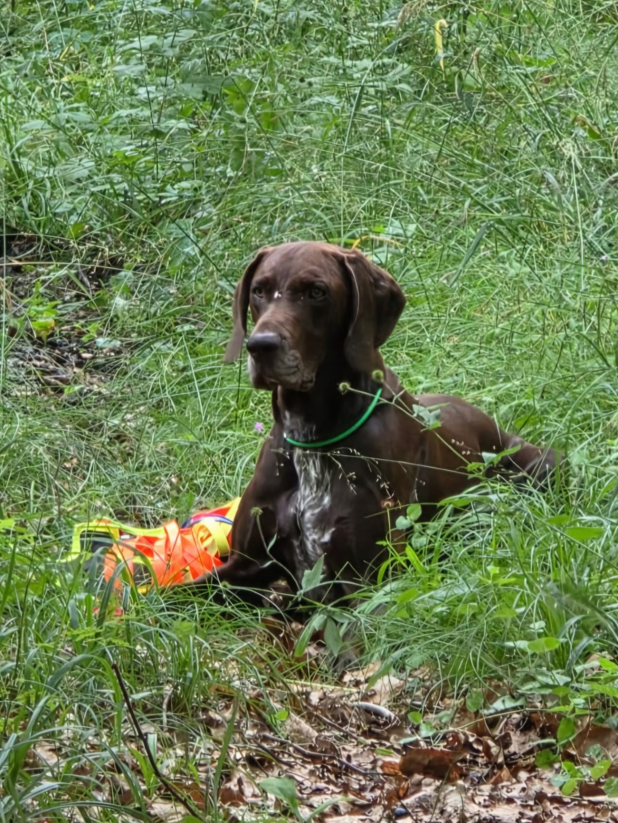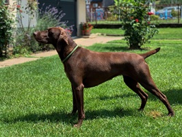 Nach Carlos von der Mainruhe, ZB.Nr.: 0942/22, gewölft am 10.05.2022 Braun mit Brustfleck, D1, VJP 68 Pkt., HZP-187Pkt., AZP1, VGP1-336 Pkt. ÜN (Nasengebrauch 4h), VStP(B)46P., Sw I/, AH, SJ, HN, HD-A1, OCD-frei, Übergangswirbel frei, Formwert: SG3 (J), Stockmaß: 65 cm