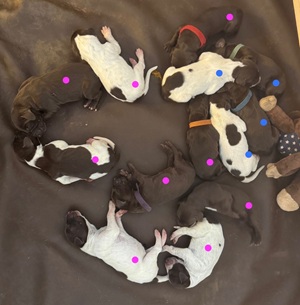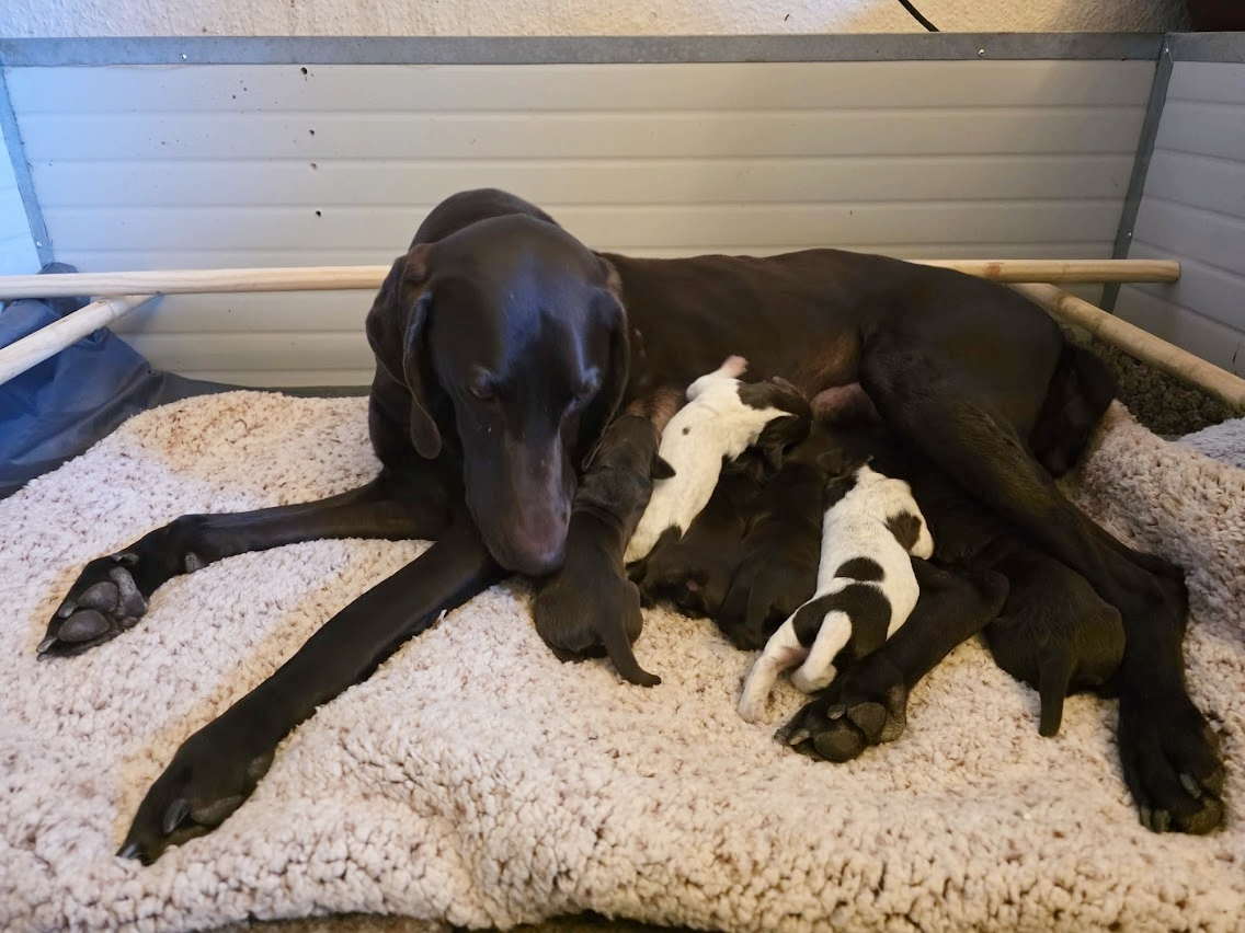 Unser vielversprechender P_II Wurf ist am 24.04.2026 mit 7,3 starken Welpen gewölft worden. In diesem Wurf sind schwarze und braune Welpen mit Brustfleck sowie schwarz- und braunschimmel Welpen gefallen.