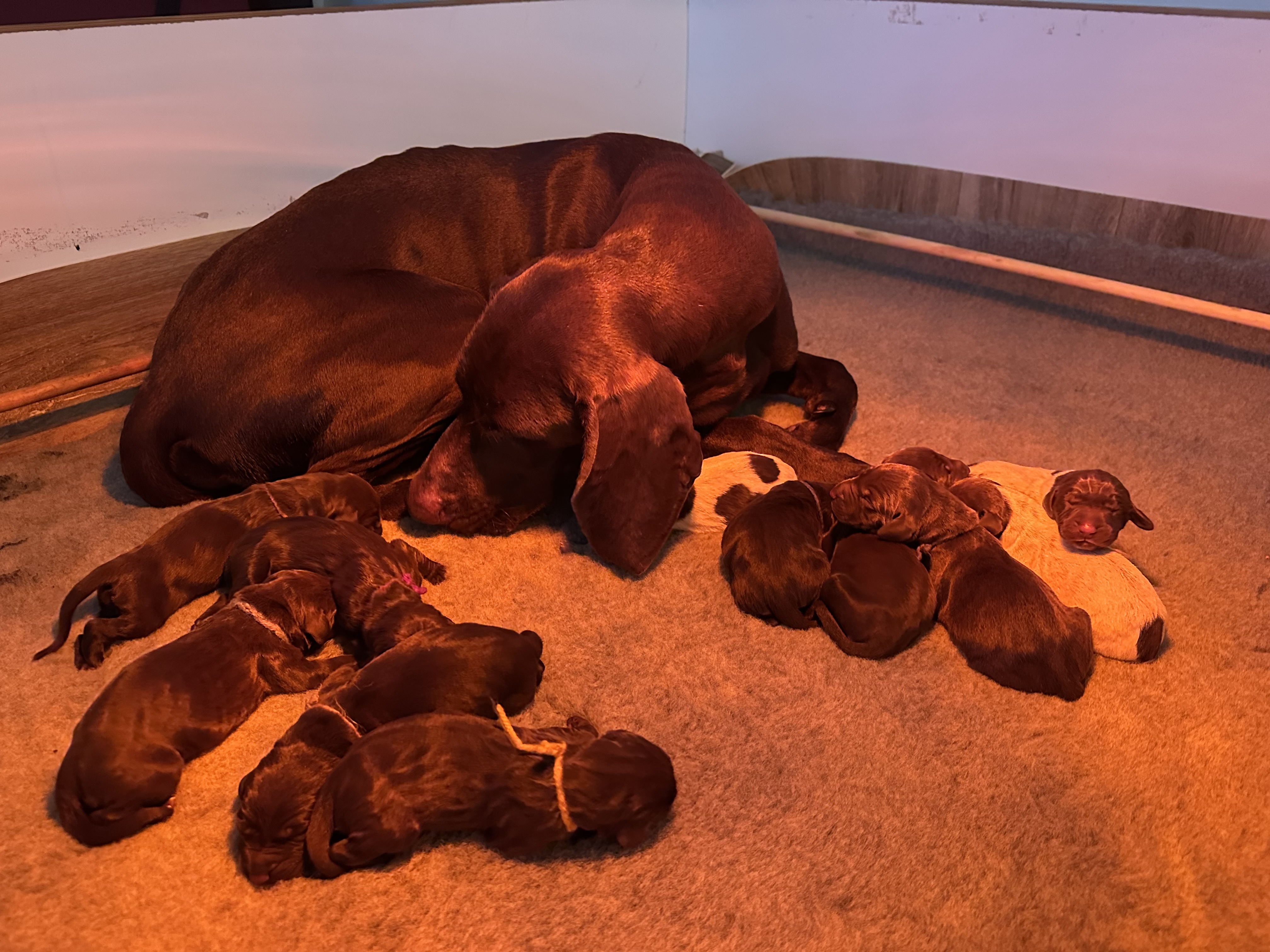 Am 22.4.2026 ist der E-Wurf von der Schlei mit 3/8 Welpen gefallen. 3 Rüden (1 Braun mit Brustfleck, 2 Braunschimmel), 8 Hündinnen (7 Braun mit Brustfleck, 1 Braunschimmel).