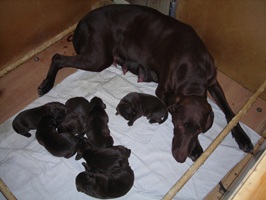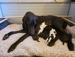 Am 6.3.2026 hat unsere Hündin 6,4 Welpen gewölft. Ein Rüde braun und die anderen Welpen braun mit Brustfleck.