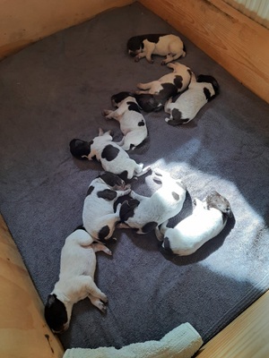 Am 01.04.2026 ist mit neun munteren, kräftigen Welpen unser C-Wurf gefallen. Er teilt sich auf in 3 Rüden (2 brschl., 1 schwschl.) und 6 Hündinnen (2 schwschl., 4 brschl.) aus