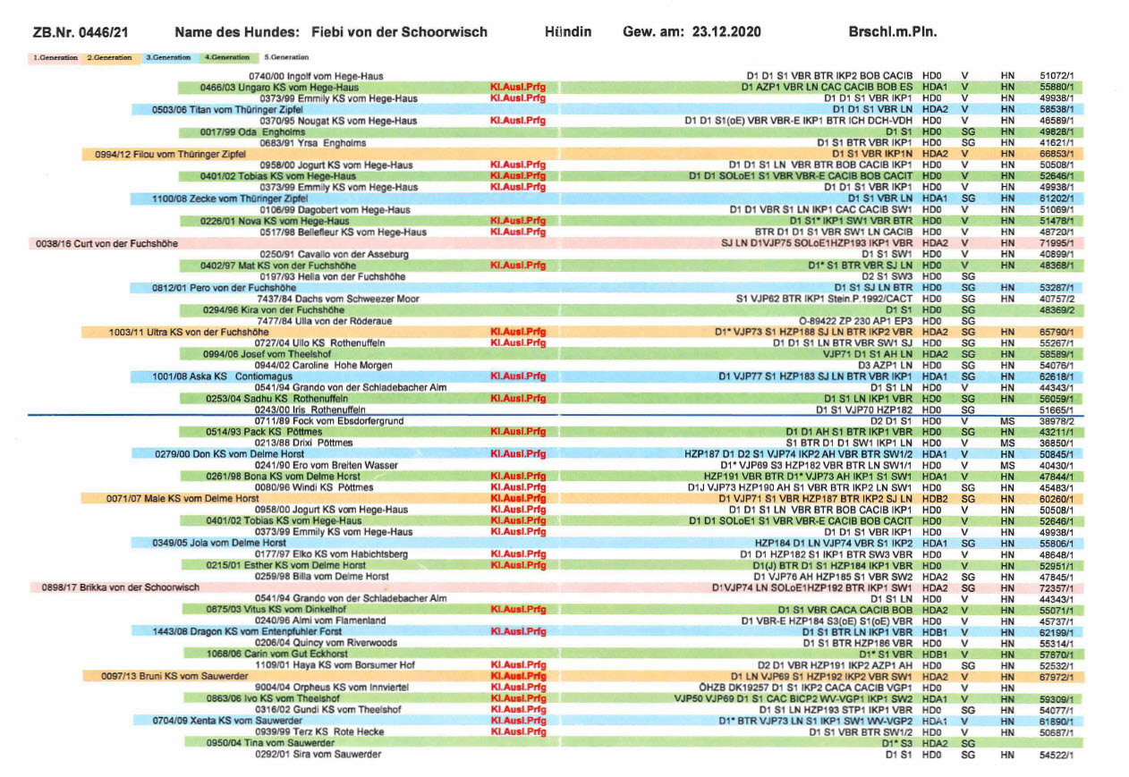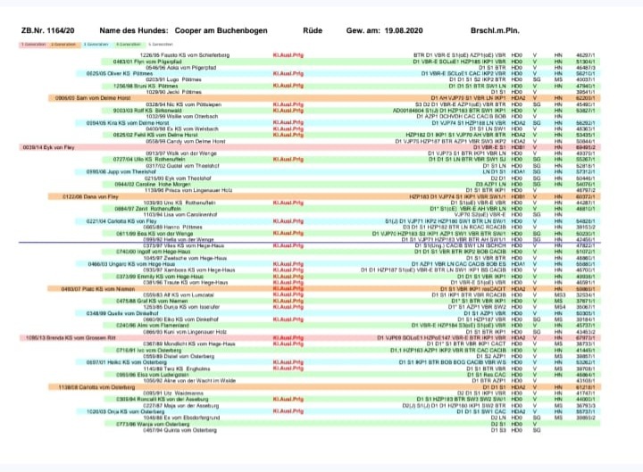Mutter: Lotte KS von der Tabakshöhe, ZB-Nr. 0793/19 Br. m. Brfl.; Gew. am 10.05.2019; D1, S1, VGP1, St. o. Ente 4h, Suche 4H, LN, BTR, VBR, Stockmaß: 60 cm, HD A1, Fw SG, OCD frei, Übergangswirbel frei.