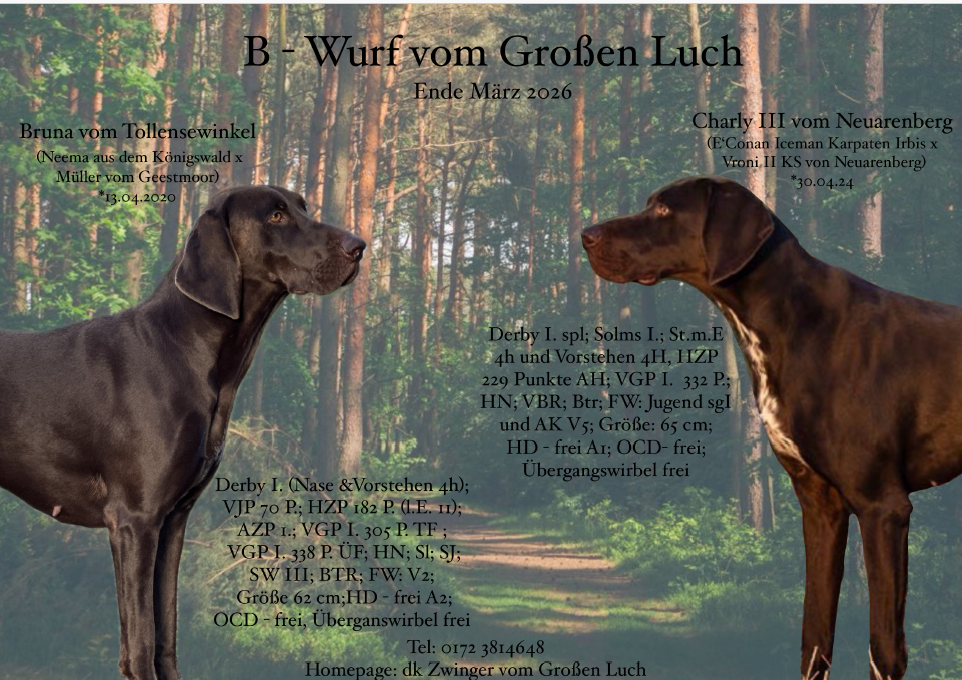 aus Bruna vom Tollensewinkel, ZB- Nr. 0701/20, gew.:13.04.2020 (Neema aus dem Königswald x Müller vom Geestmoor): VJP 70 P. Derby 1.Preis (Nase+ Vorstehen 4h), sil, HZP 182 P., AZP 1. Preis, VGP 305 P. TF, VGP 338 P. ÜF, HN, SJ, SW III, Brauchbarkeit Brandenburg A/B/C/D/E, V2, HD A2, OCD-frei,Größe 62 cm Bruna ist eine leistungsstarke, sehr gut pigmentierte, substanzvolle Hündin und besticht durch Wesensfestigkeit und ihr angenehmes ruhiges Wesen.