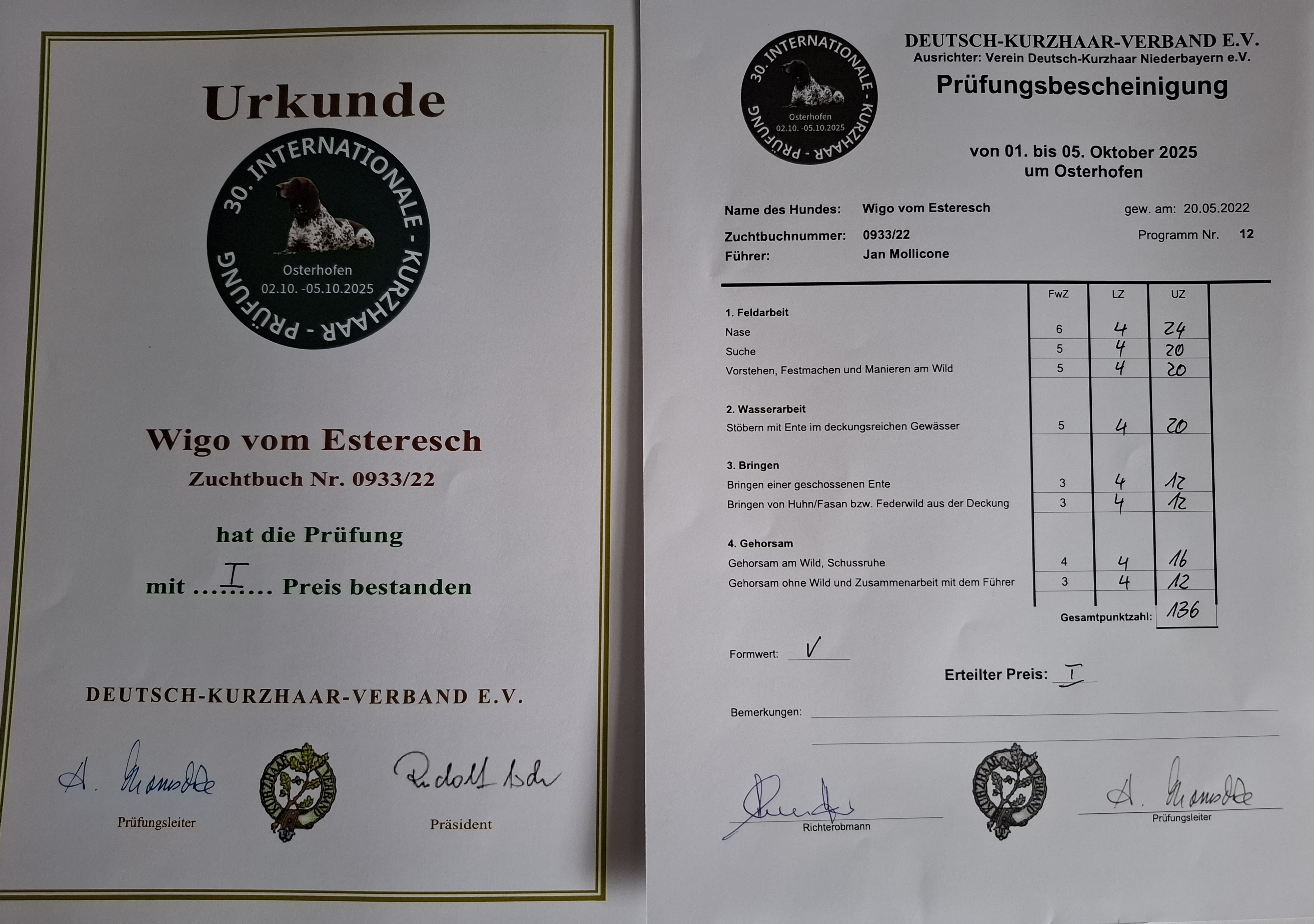 D1, S3, HZP- 177 Pkt., VGP 1- 336 Pkt.- ÜN- Vorstehen 4h, VSwP 20h 2.Preis, VFsP 20h 1. Preis, HN, sichtlaut HD- A1, OCD- frei Formwert: sg1 Jugendklasse, V1 Gebrauchshundeklasse, Anw.Dt.Ch., BOS mittleres Auge Stockmaß: 65 cm