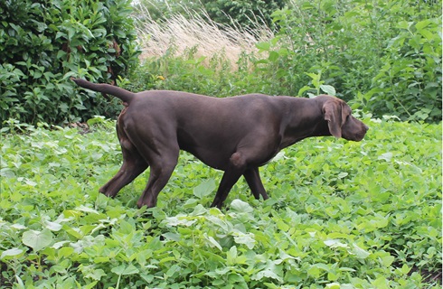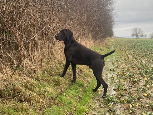 Jack vom Hirschenacker ist ein freundlicher, nervenstarker, brauner Rüde mit Brustfleck, dunklem Pigment des Mittelschlags, geradem Rücken, korrekter Brusttiefe und sehr schönem Rüdenkopf. Jack arbeitet am Raubzeug kompromisslos, dass er mit dem Härtenachweis schon mit 10 Monate unter Beweis stellte. Mit 13 Monate meisterte er die Bringtreue. Seine sehr gute Nase zeigt sich bei der Schweißfährte, sowohl beim stöbern an Land, als auch am Wasser. Im Wasser zeigt er Härte und Durchhaltewillen, er apportiert zuverlässig mit großer Freude. An dem Schwarzwild arbeitet er mit dem nötigen Druck und Verstand. Jack arbeitet sicher „Sichtlaut“. Er wird aktuell auf die IKP vorbereitet.