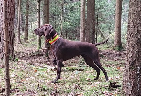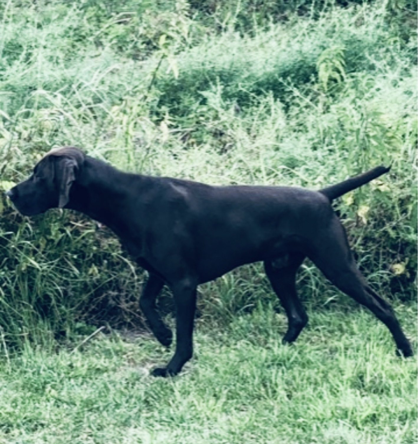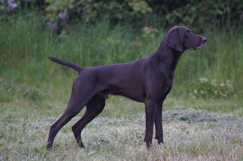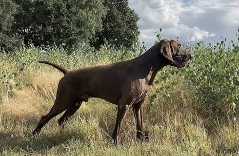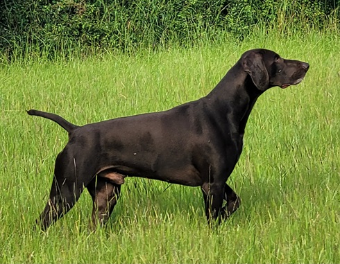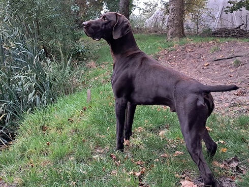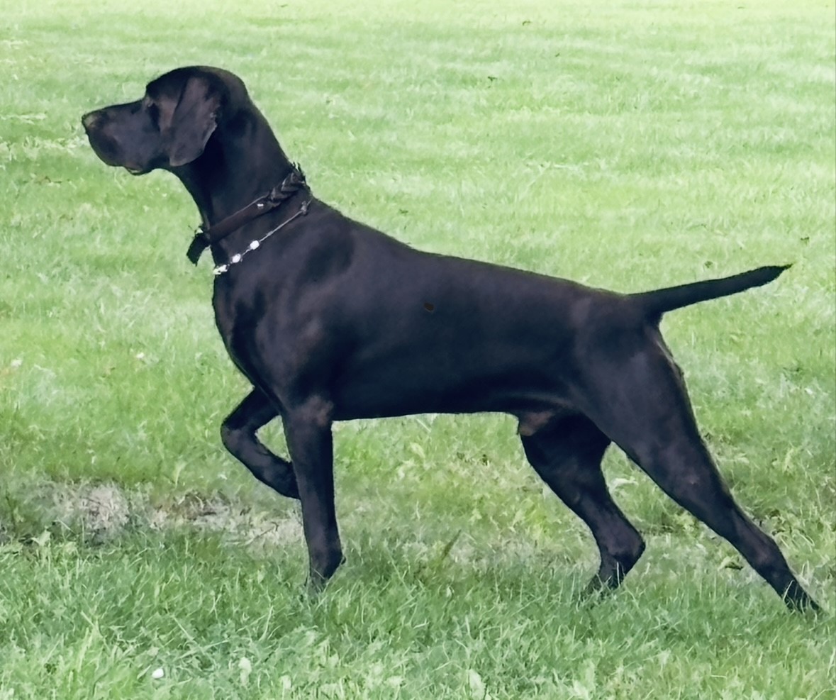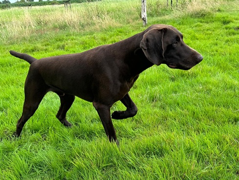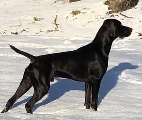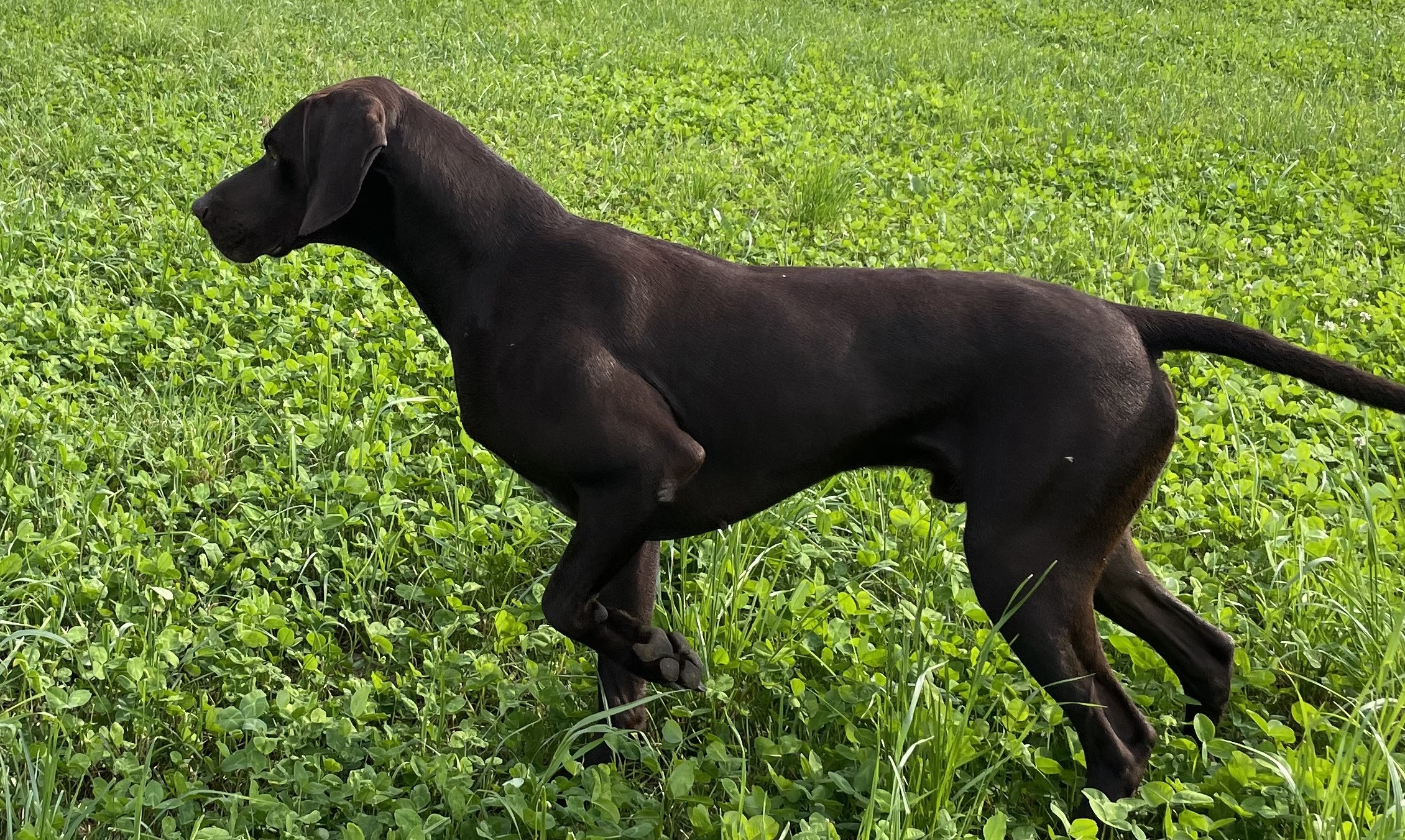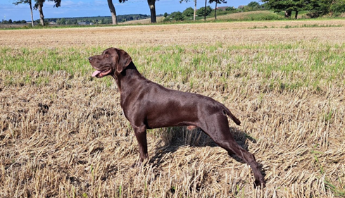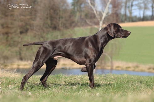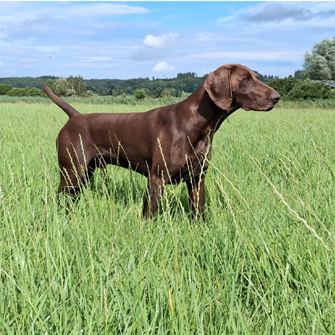 Ein ansprechender Typvoller Nachwuchsrüde mit maskulinem Kopf und bestehendem tiefdunklen Braun, Er stammt aus einem Leistungsstarken frühreifen Wurf mit hohen Formwerten. Seine Stärke zeigt er im Wasser mit ausgeprägtem Durchhaltewillen, sowie im Feld mit einer brillanten Nasenführung und Kopfhaltung und bei der Nachsuche im Wald. Er ist ein ruhiger verträglicher Jagdgefährte der im Jagdbetrieb viel Freude beschert.