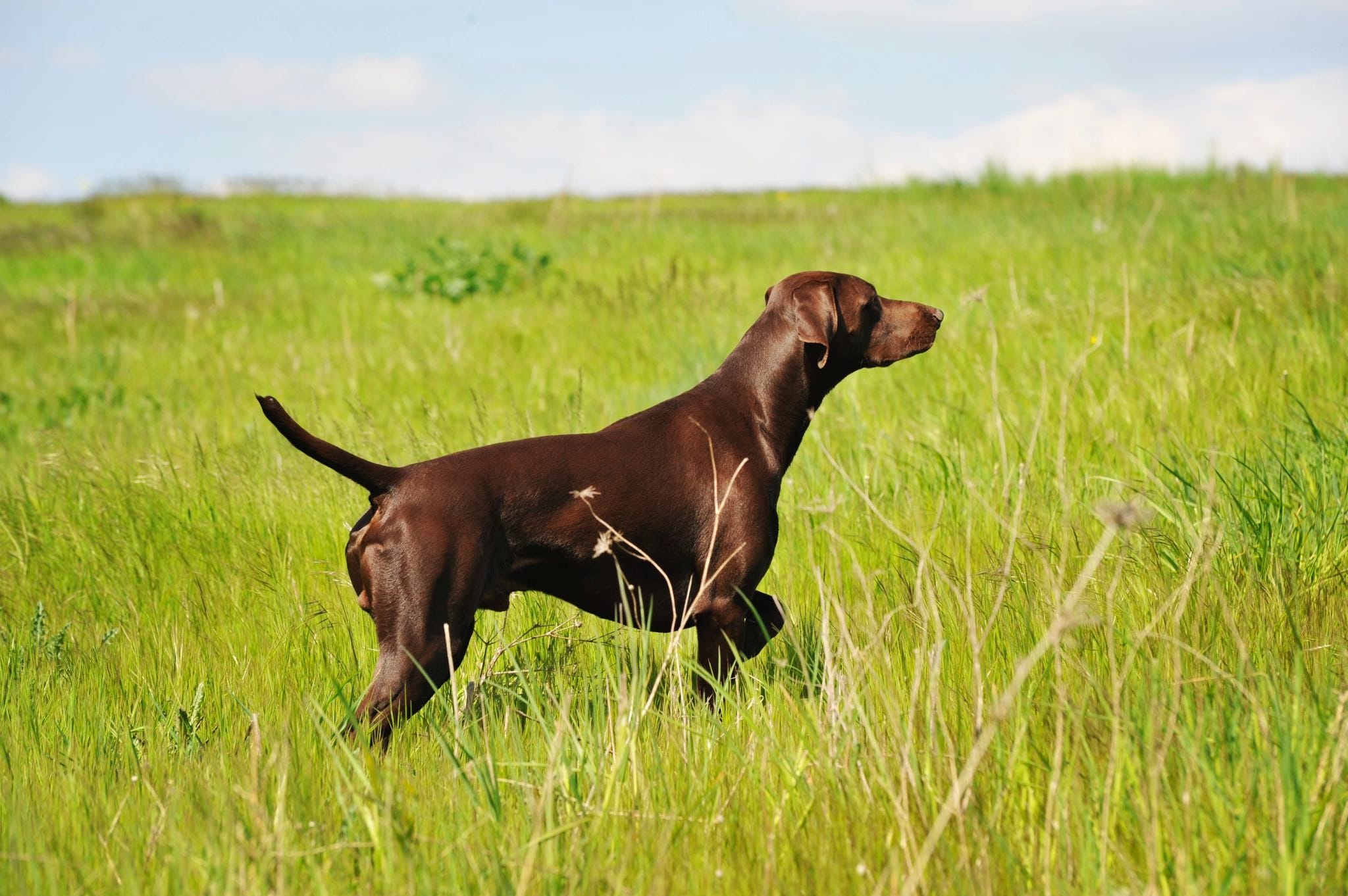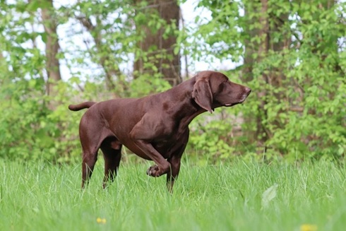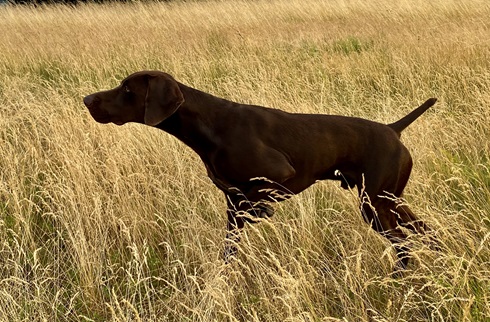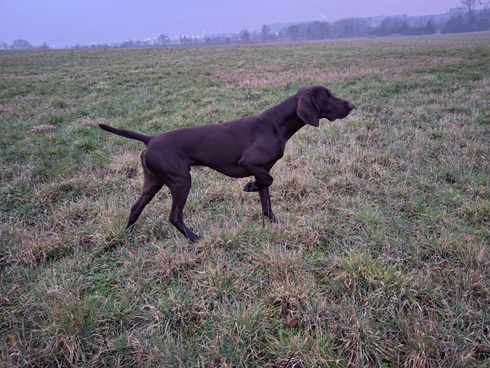 ZB.Nr.: 0942/22, gewölft am 10.05.2022, Braun mit Brustfleck, D1, VJP 68 Pkt., HZP-187Pkt., VGP1-336 Pkt. ÜN (Nasengebrauch 4h), VStP(B)46P., AH, SJ, HN, sichtlaut HD-A1, OCD-frei, Übergangswirbel frei Formwert: sehr gut (SG3, Jugend), Stockmaß: 64 cm
