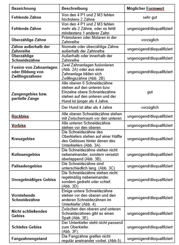 Für die Bewertung „vorzüglich“ muss der Hund ein korrekt schließendes, vollständiges Scherengebiss aufweisen. Überzählige Zähne darf es bei den Schneidezähnen (Incisivi) nicht geben (auch wenn sie in der Zahnreihe stehen), bei den Prämolaren und Molaren können sie vorhanden sein, wenn sie korrekt in der Zahnreihe stehen.