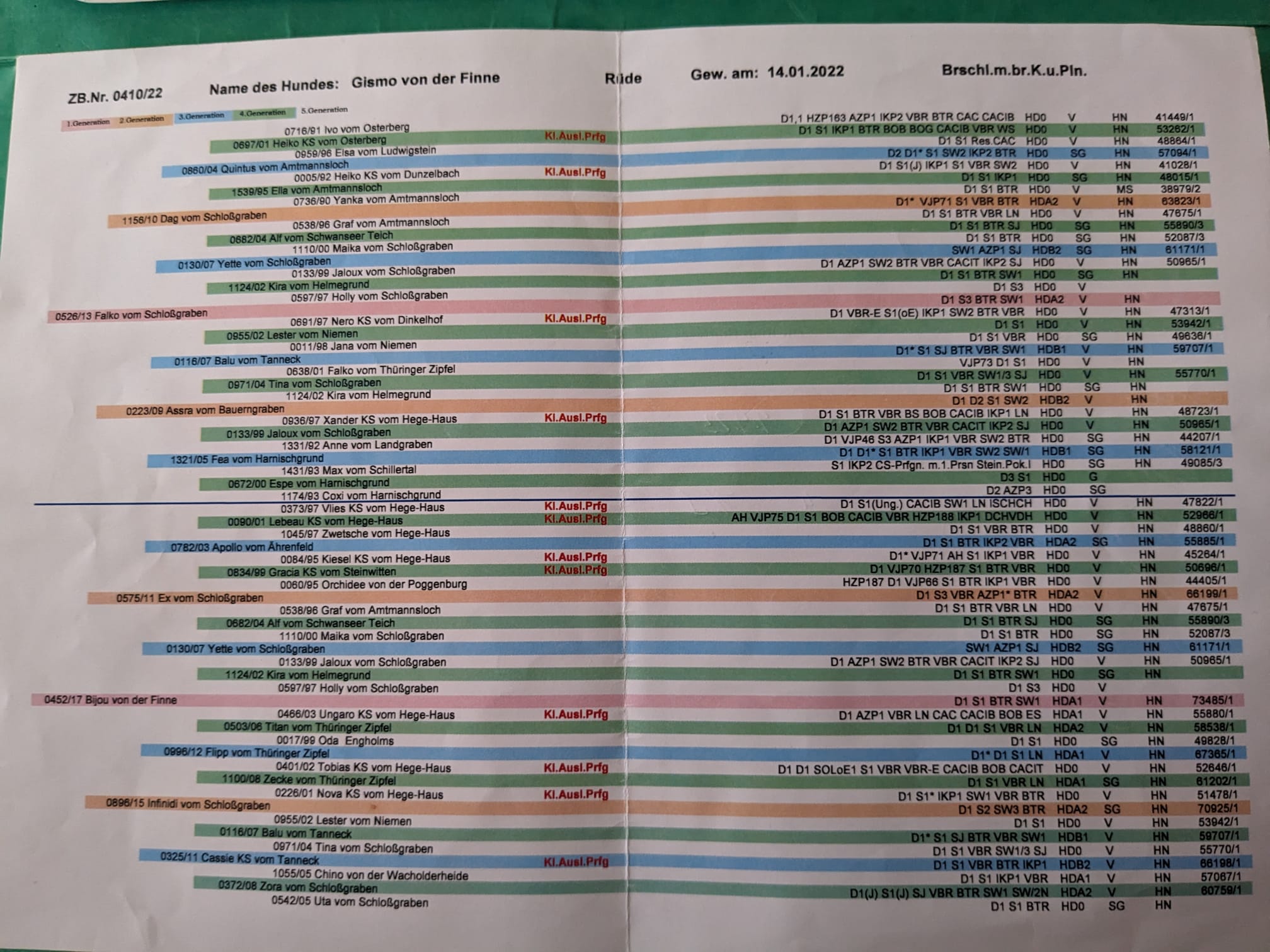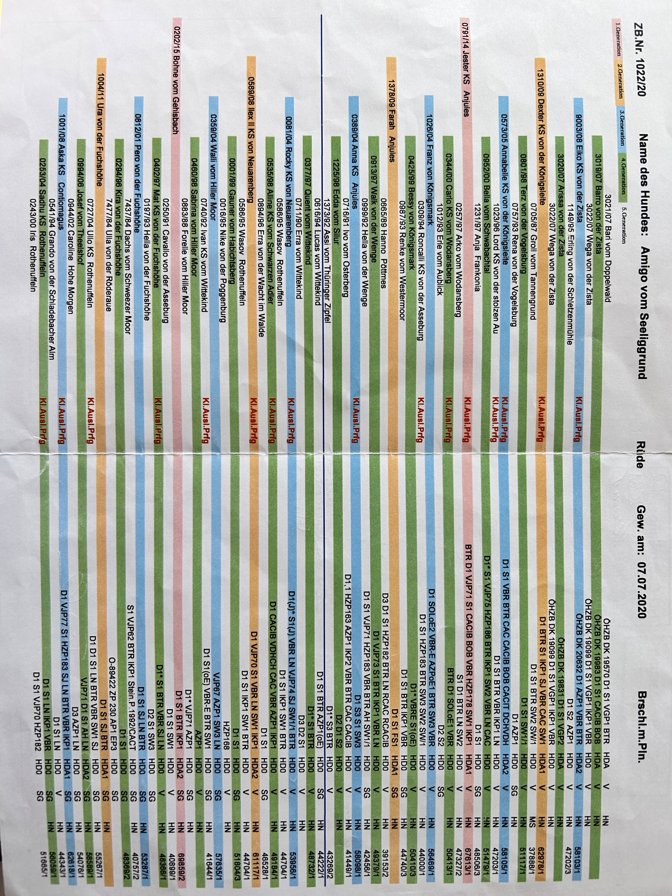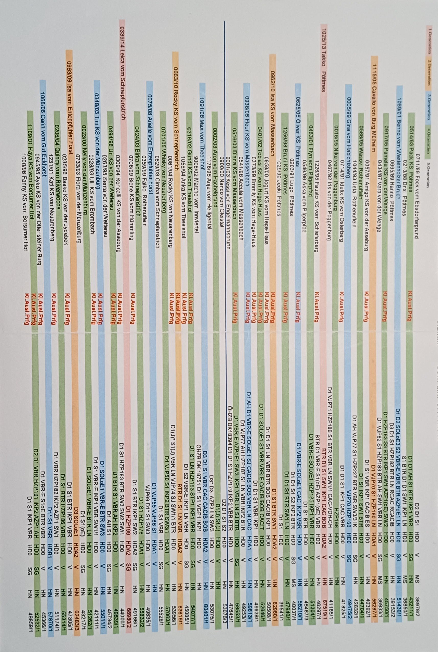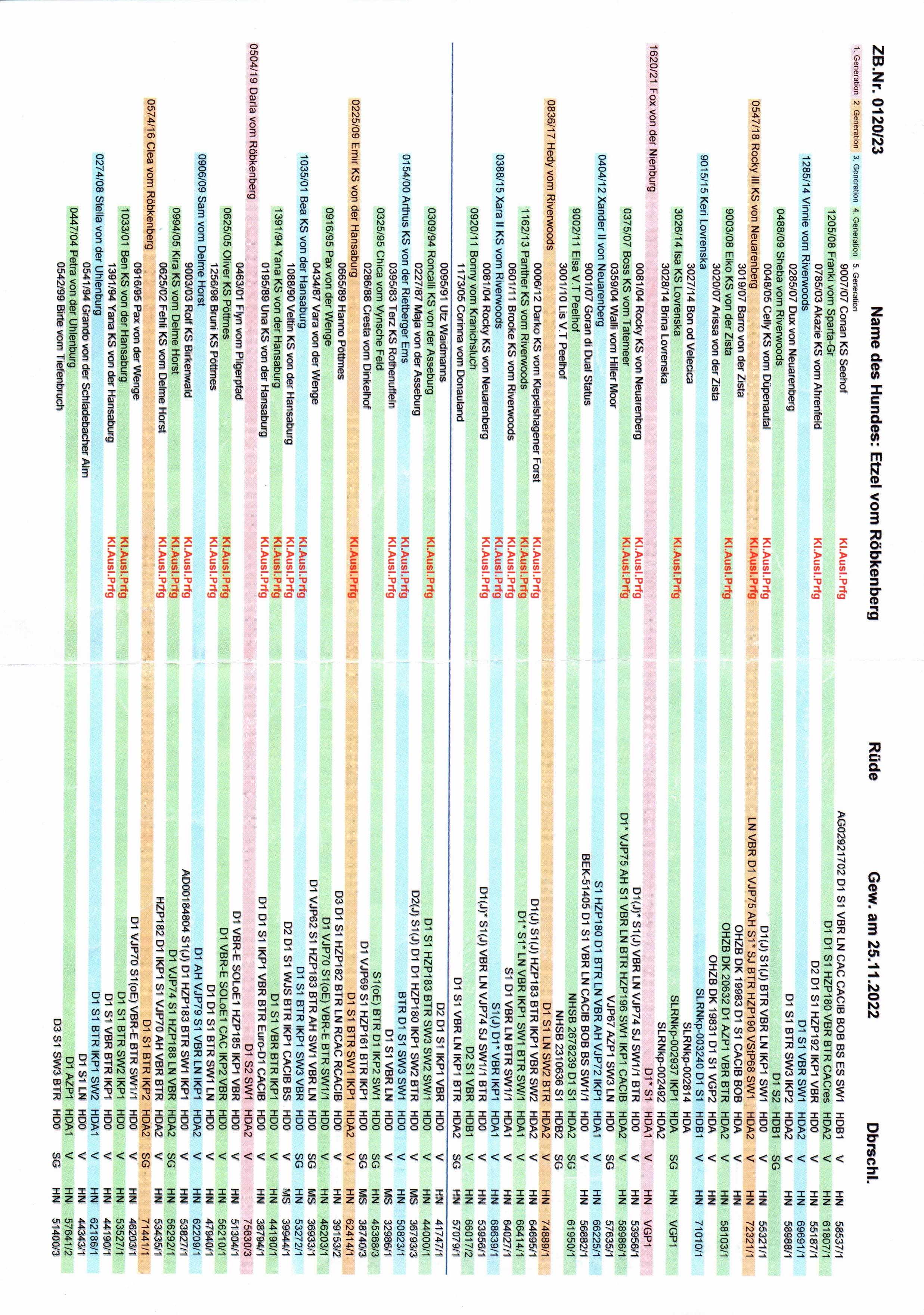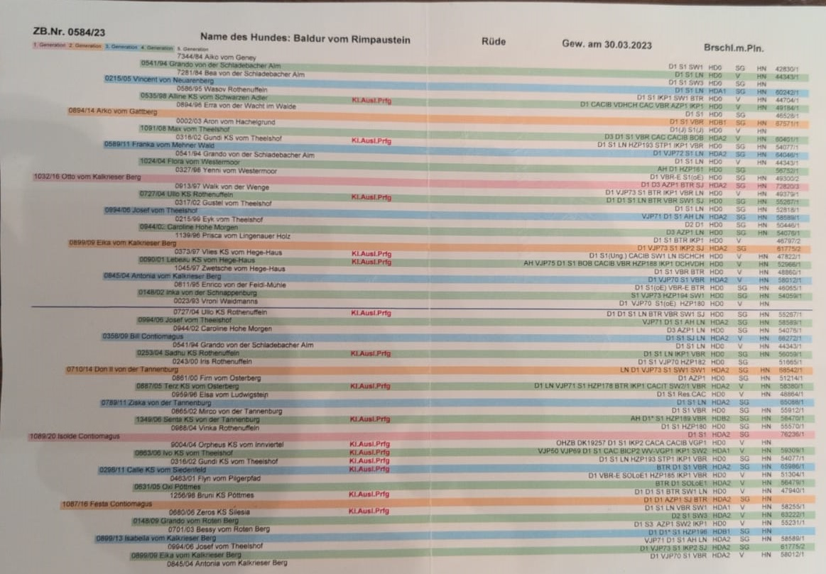 BTR, D1, VAV, S1, VGP (322 P., 1.P.), BP §6 & §7, HN, LN, FCI- BH/VT, HD A2, ED & OCD frei, Übergangswirbel frei, Genetik: JEB N/N, v. Willebrand Typ b2 N/N, DNA-Profil ISAG 2020