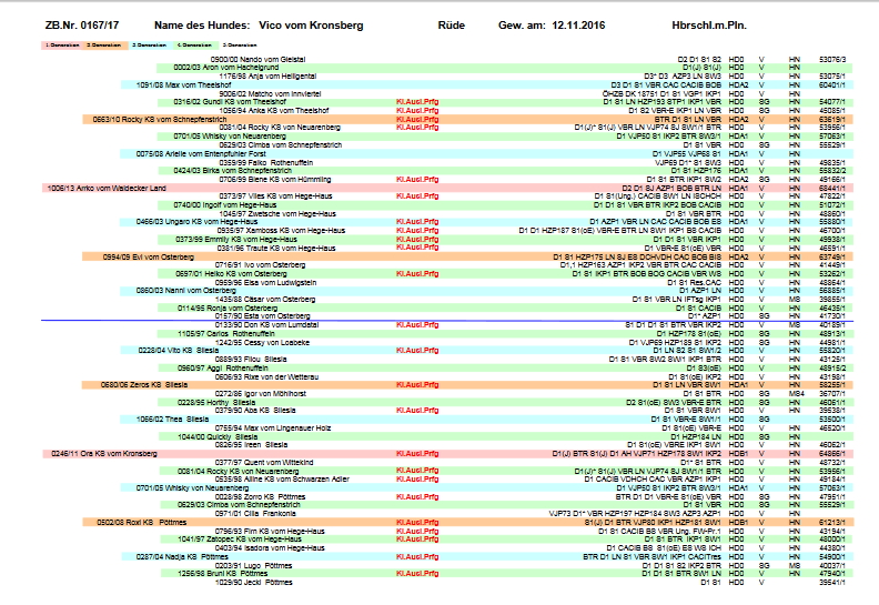 ZB-Nr.:1005/16, Brschl. m. br. K. u. Pln., gew. 20.06.2016, D1, S1, VGP (II.Preis), VSchwP 1. Preis/ Suchensieger, SchwP 1000m, BTR, Brauchbarkeit, Langschleppenprüfung 800 m, 1.200 m , HN,LN, BH-IPO, Formwert: SG1(J), V1, Deutscher Champion (VDH), Deutscher Champion (Klub), CACIB,CAC, BOB, Frühjahrssieger 2022, OCD-Schulter beidseitig frei, HD-B1, Übergangswirbel frei, vWB-Typ N/N, JEB N/N frei