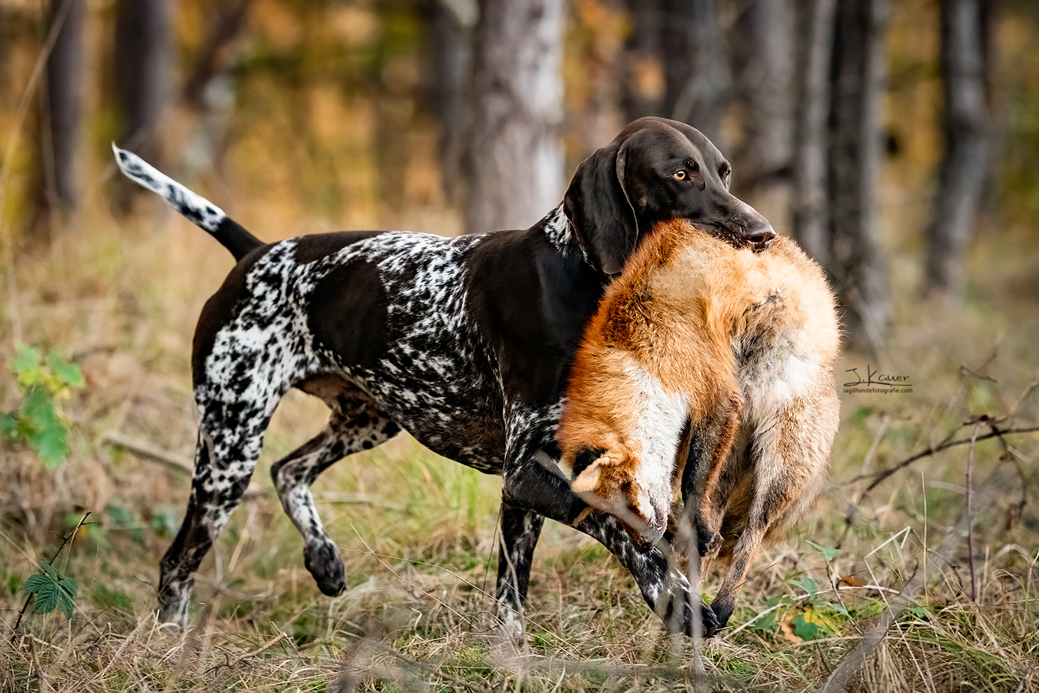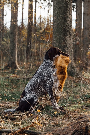 Auf der Schweißfährte arbeitet er ruhig, konzentriert und nah am Boden. Er zeigt Laut am gefundenem Wild. Bei Raubwild ist er kompromisslos.