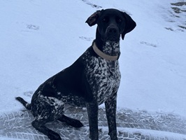 Falka, gew. 16.01.2023, ZB Nr. 0241/23, Farbe schwschl. m. schw. K. u. Pln., Derby 1 Pr., Vorstehen 4h, Solms 1. Pr., Nase 4h. Brauchbarkeit, VGP 1. Pr., HN