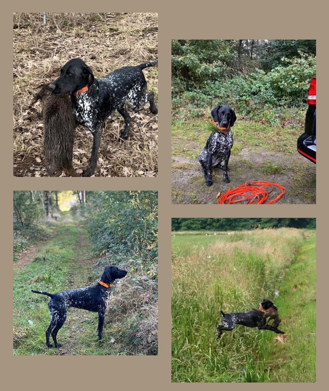 Er ist unerschrocken, gelassen und wird regelmäsßig mit ins Revier genommen, wo er bereits gute Such-und Vorstehleistungen zeigt. Sehr starke Wasserpassion.