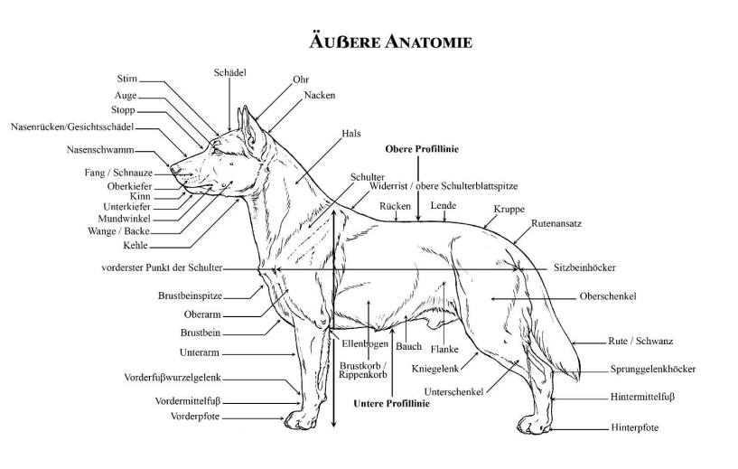 Brust: Mehr tief als breit mit gut ausgeprägter Vorbrust und möglichst weit nach hinten reichendem Brustbein. Brustbein und Ellenbogengelenk sollen in gleicher Höhe liegen. Rippen gut gewölbt, weder flach noch tonnenförmig. Hintere Rippen gut herabreichend. Untere Profillinie und