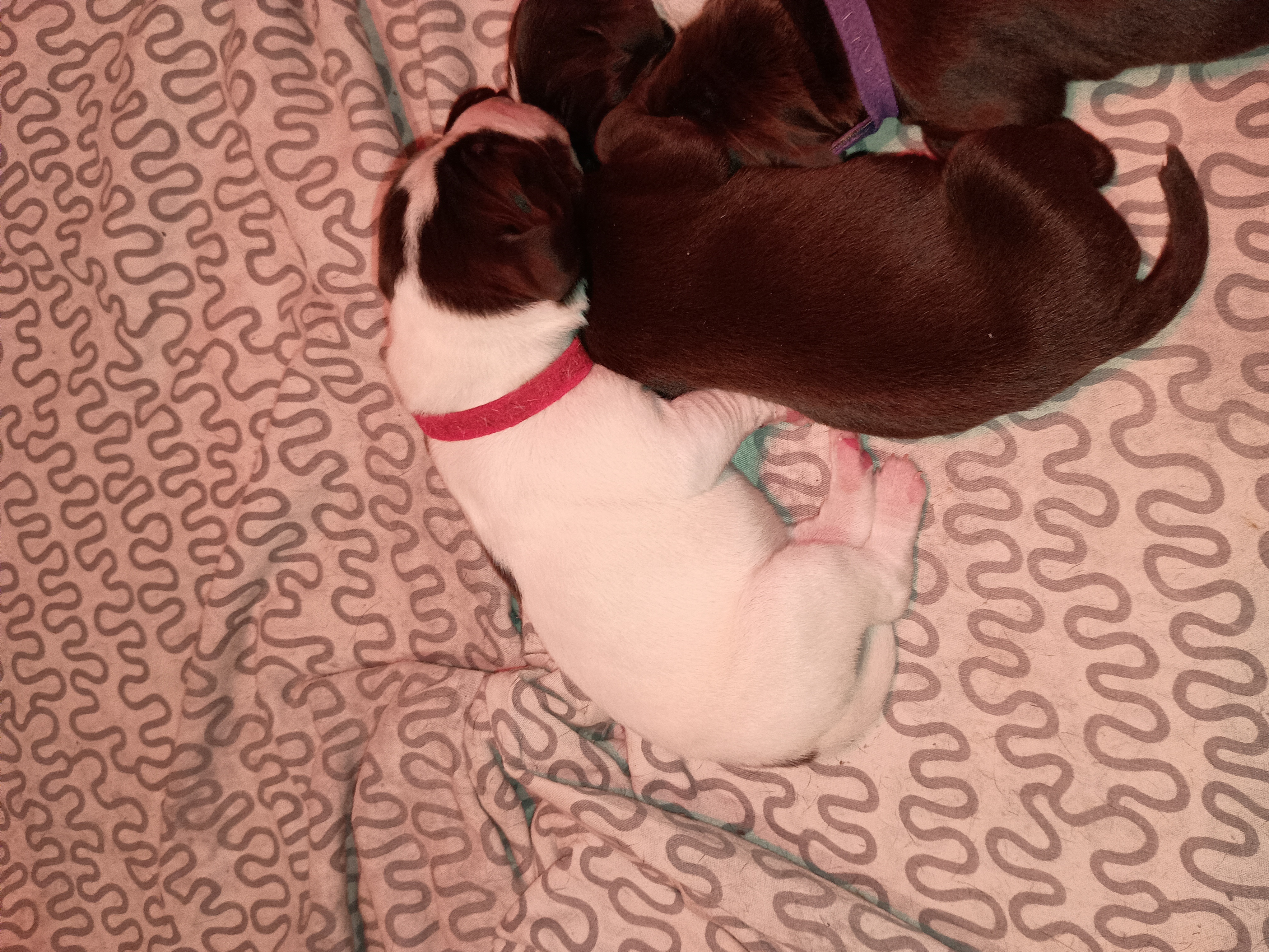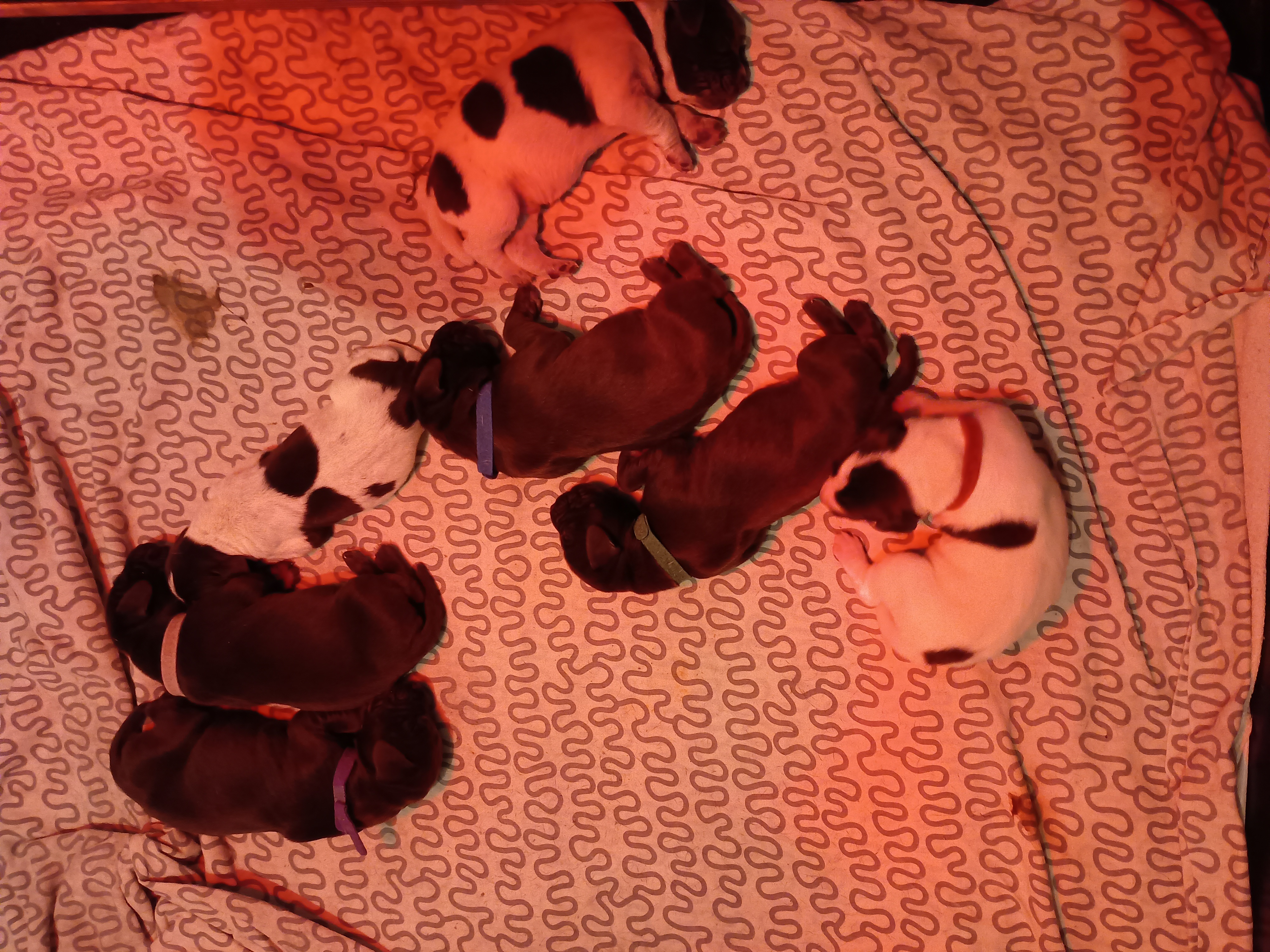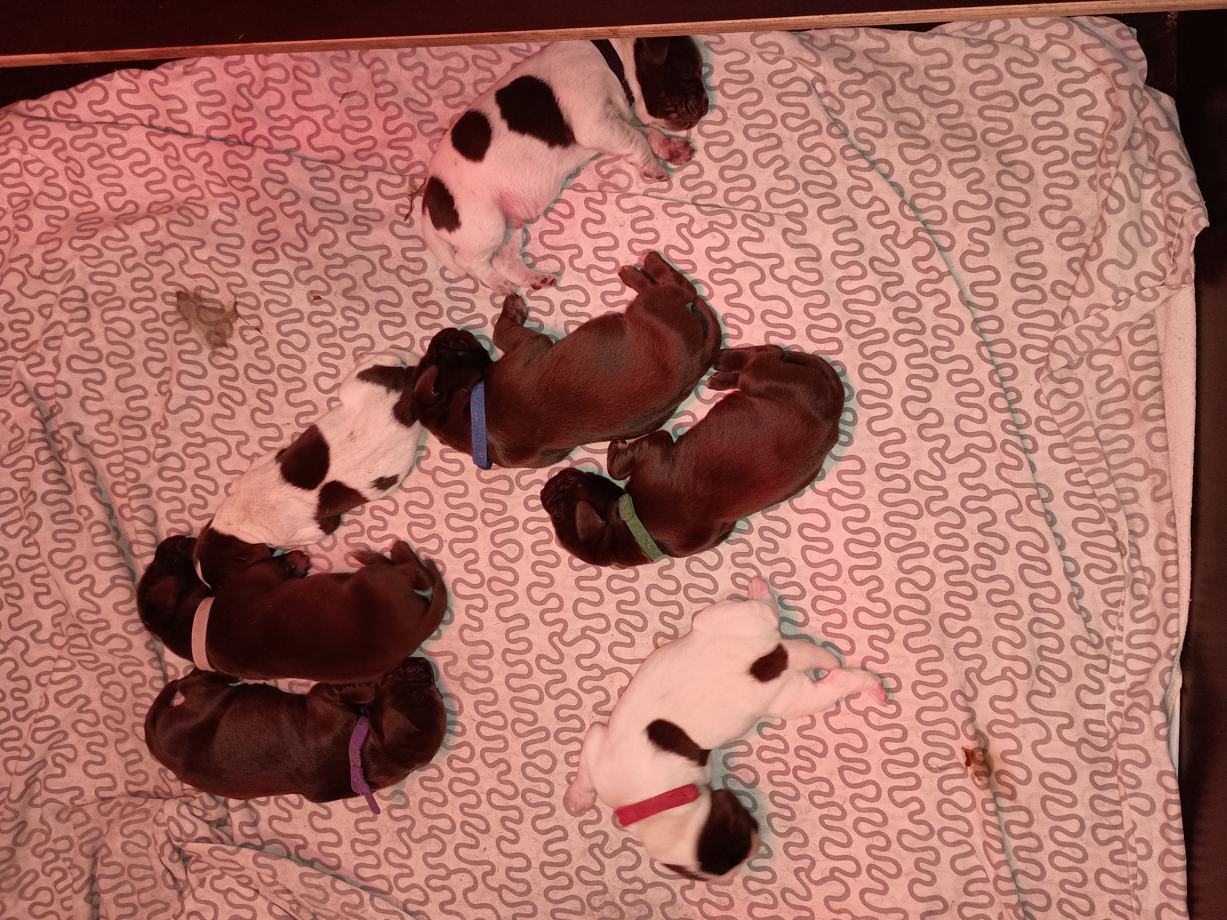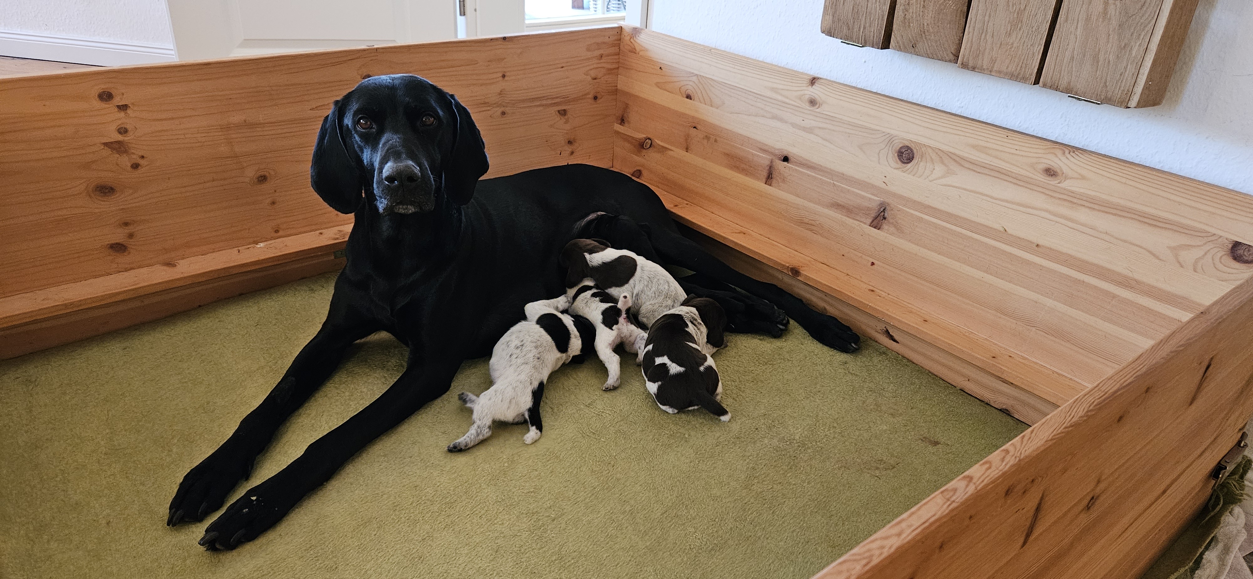 Am 12.12.25 ist unser Q-IV Wurf mit 3,5 Welpen gefallen, braun, hbrschl. und weiß.