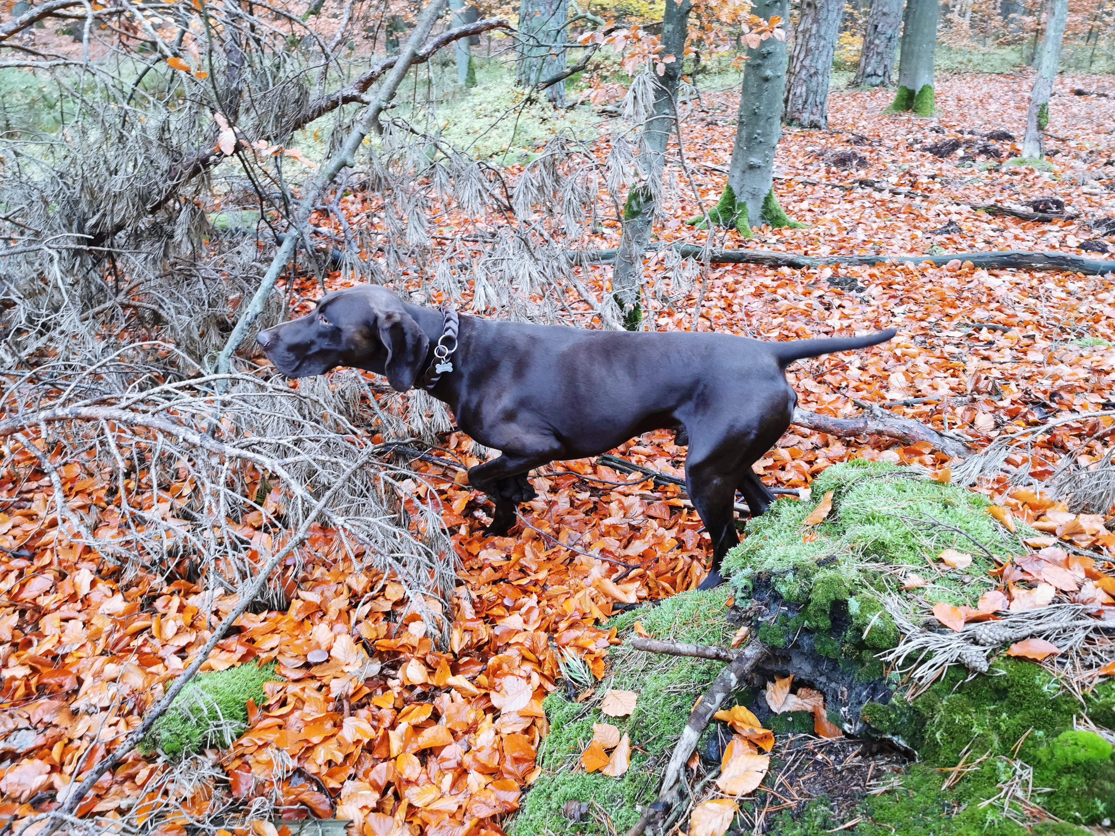 Eila ist eine elegante und erfahrene Hündin mit viel Arbeitsfreude. Sie will gefallen und mit ihrem Führer zusammenarbeiten. Daher war ihre Ausbildung relativ einfach. Das Apportieren bereitete ihr bereits im Welpenalter größte Freude, sodass sie niemals Wild zurücklassen würde. Eila zeigt beste Vorstehmanieren mit einer sehr feinen Nase. Im Wasser arbeitet sie passioniert, systematisch und intelligent, um auch jede beschossene Ente zu finden. Sie arbeitet kompromisslos am Raubwild sowie scharf aber überlegt an Sauen. Trotz ihrer sehr gut bestandenen Schweißprüfung, muss ich sagen, dass ihre dafür nötige Konzentration auf langen und schwierigen Fährten irgendwann nicht mehr ausreichend ist, um diese erfolgreich zu beenden. Kurze Tot- oder Kranksuchen hingegen sind ihr Steckenpferd bis hin zum anhaltend lauten Stellen, Niederziehen oder Bringselverweisen des Wildes.