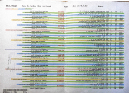 nach „Chico von den Schaaltannen“ (Ira vom Tatemeer x Herzog KS vom Klepelshagener Forst) ZBNr.: 0609/21, D1, S1, VGP1, SJ, BTR, HN, HDA2, OCD bds. frei, Formwert V1 gefallen.
