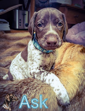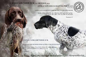 Vater: Etzel vom Röbkenberg, ZB.Nr. 0120/23, D1 (Suche + Vorstehen 4h), S1 (J), VGP1 323 P, Btr, HN, Formwert: sg 2 (j), V1 (AK), V2 (VDH German Winner Show), HD 0(A2), OCD-frei, Übergangswirbel frei, Stockmaß: 65cm