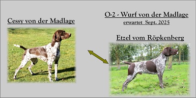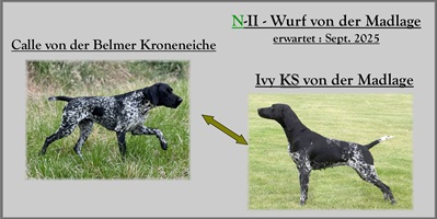 Mit dieser Verpaarung werden sehr leistungsstarke und im Formwert sehr hoch stehende Hunde vereint, die das Zuchtziel unseres Zwingers festigen sollen. Aus dem F_II, I-II und J_II Wurf konnte Cessy als instinktsicherer Mutterhündin sehr leistungsstarke und formwertlich hochstehende Jagdhunde wölfen. Alle Junghunde stehen in der Ausbildung und im Jagdalltag und konnten hier ihr Können bestätigen, auch wurde schon mehrfach der hohe Formwert bestätigt. Ihre Tochter Ivy hat 2024 den KS-Titel erhalten.