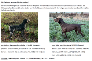 Mutter: Carla vom Oderstrom, ZB-Nr. 0612/20, gew.: 27.03.2020, Brschl. mit Pln., Leistungen: D1, S1, VJP 72 Pkt., HZP 193 Pkt., VGP1 (310 Pkt.), SJ, Gesundheit: HDA2, OCD-frei, Formwert: JK SG, V2, Größe: 62 cm.